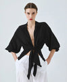 Κιμονό με μακριά φουσκωτά μανίκια και βολάν στις μανσέτες. Διαθέτει πλαϊνά ανοίγματα και κλείσιμο με δέσιμο μπροστά.