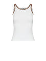 Λευκό rib top John Richmond που ξεχωρίζει για τις λαμπερές λεπτομέρειες με strass στους ώμους και στη λαιμόκοψη. Αγκαλιάζει το σώμα και αναδεικνύει τη σιλουέτα, ενώ το ελαστικό ύφασμα προσφέρει άνεση όλη μέρα. Ένα κομμάτι που συνδυάζει απλότητα με διακριτική πολυτέλεια.